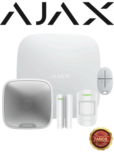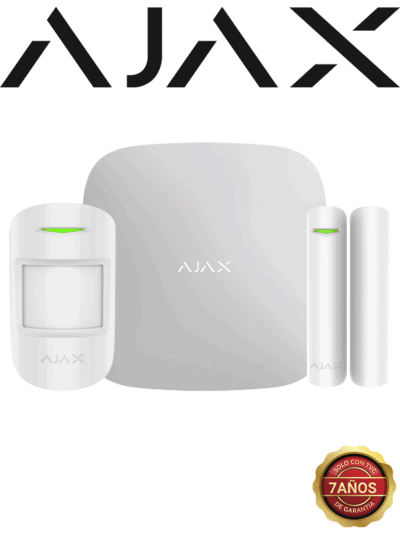 El KIT STARTER AJAX es una solución inalámbrica que incluye panel de control Hub 2 plus, un sensor de movimiento MotionProtect y un detector de puerta o ventana DoorProtect. Comunicación mediante protocolo Jeweller.