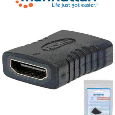 - Conecta fácilmente dos cables HDMI para trabajar sobre largas distancias.El adaptador HDMI Manhattan es ideal para unir dos cables HDMI para dar longitud adicional a un cable de manera pasiva. Este Cople HDMI permite una resolución 4K y un ancho de banda de 10.2 Gbps a 340 MHz.Conecta 2 cables HDMI