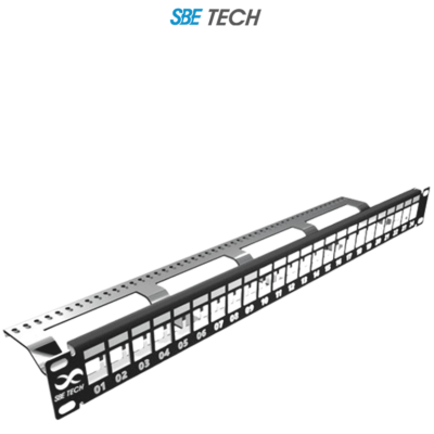 Panel de parcheo modular blindado, de montaje en sistemas de 19”, diseño plano, con 24 puertos tipo keystone para montaje de cualquier Jack de la marca SBE TECH, cuenta con un riel en la parte posterior para fijación y como soporte para asegurar el radio de curvatura de instalación del cable, al insertar cada Jack blindado en su posición se asegura la continuidad a tierra para garantizar la máxima protección contra interferencias externa.