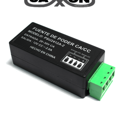 El convertidor de corriente alterna a continua Saxxon modelo PSU2412A2, nos sirve para poder llevar la energia a nuestras camaras cuando se encuentran a larga distancias gracias a que el equipo trabaja con un elimindador que se vende por separado de 24 V CA y al llegar a la camara se coloca este transformador para convertir la corriente a 12 V DC hasta 2000 mA por lo que es capaz de energizar cámaras IR, cámaras PTZ u otros dispositivos que requieren