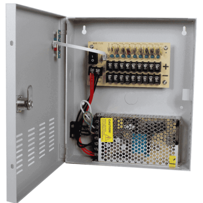 Es una fuente de poder regulable metálica diseñada para alimentar hasta 8 dispositivos simultáneamente. Sirve para proporcionar un voltaje ajustable de 12V, 13V o 15V CC, con una salida total de hasta 5 amperios en sus canales. Beneficios: permite ajustar el voltaje según las necesidades de los dispositivos conectados, ofrece una conexión de múltiples canales para una instalación más sencilla y ordenada, y se monta en la pared para un manejo eficiente. Es ideal para sistemas de seguridad y videovigilancia que requieren una fuente de alimentación robusta y versátil.