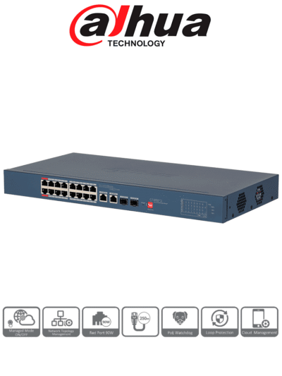 DAHUA DH-CS4220-16GT-135 Switch Poe de 16 Puertos Gigabit/ Poe Inteligente/ Puerto Rojo de 90W/ 135 Watts Totales/ 2 Puertos SFP/Poe Watchdog/ Switching 40 Gbps/ Protección de Descargas/ Plataforma DoLynk Care