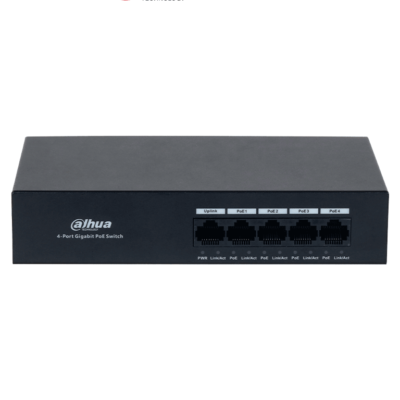 DAHUA DH-PFS3005-4GT-36 - Switch con 4 puertos Gigabit PoE y 1 puerto RJ45 10/100/1000 Mbps. Ofrece protección contra descargas eléctricas, ideal para alimentar dispositivos IP. Incluye fuente de poder integrada.