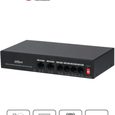 DAHUA PFS3006-4ET-36 - Switch PoE de 6 Puertos Fast Ethernet/4 Puertos PoE 10/100/ 2 Puertos uplink 10/100/ 36 Watts Totales/ Switching 1.2 Gbps/ Tasa de Reenvio de Paquetes .89 Mbps/ con Protección de Descargas #SwitchD1