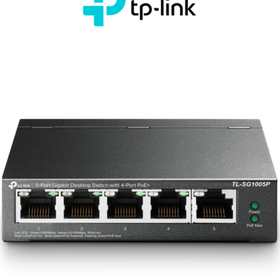 TP-LINK TL-SG1005P - Switch Escritorio No Administrable de 5 puertos 10/100/1000 Mbps, con 4 puertos PoE 802.3af/at de hasta 65 W y PoE Extendido hasta 250 metros.