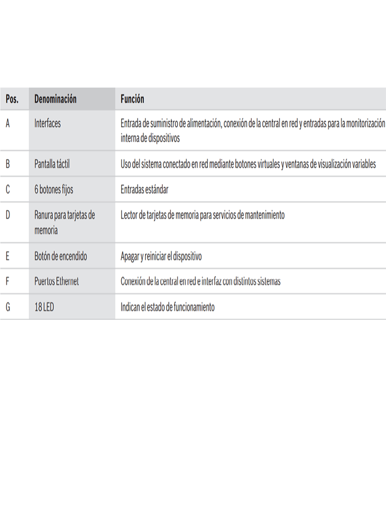 Todos los mensajes se muestran en la pantalla en colores vivos. Los mensajes visualizados contienen la información siguiente: • Tipo de mensaje • Tipo del elemento activador • Descripción de la ubicación exacta del elemento activador • Zona lógica y subdirección del elemento activador 18 LED con iconos proporcionan información continua sobre el estado de funcionamiento del panel o del sistema. Un LED con el icono rojo muestra una alarma. Un LED con el icono amarillo parpadeante muestra un fallo. Un LED con el icono amarillo fijo indica una función desactivada. Un LED con el icono verde muestra un funcionamiento correcto. Dos LED de estado, uno rojo y uno amarillo, son programables. El rojo muestra una alarma autodefinida. El amarillo muestra un fallo o una desactivación autodefinidos. Existen módulos de anuncio adicionales, cada uno de ellos con 16 LED rojos y 16 LED amarillos para indicar más alarmas, fallos o desactivaciones autodefinidos. Funcionamiento y procesamiento de mensajes Para hacer funcionar el panel, se coloca un panel táctil de 8 pulgadas encima de la pantalla como medio de entrada. Hay 6 botones con funciones fijas y 3 teclas de función programables. Ejemplos de asignación de las teclas de función: • Poner el controlador de central en modo de día; poner el controlador de central en modo noche • Activar puntos o salidas de detección; desactivar puntos o salidas de detección • Ajustar la sensibilidad estándar de los sensores; ajustar la sensibilidad alternativa de los sensores Cada tecla de función tiene un indicador de estado virtual. Un operador con derechos de usuario suficientes puede usar las teclas de función en cualquier momento.