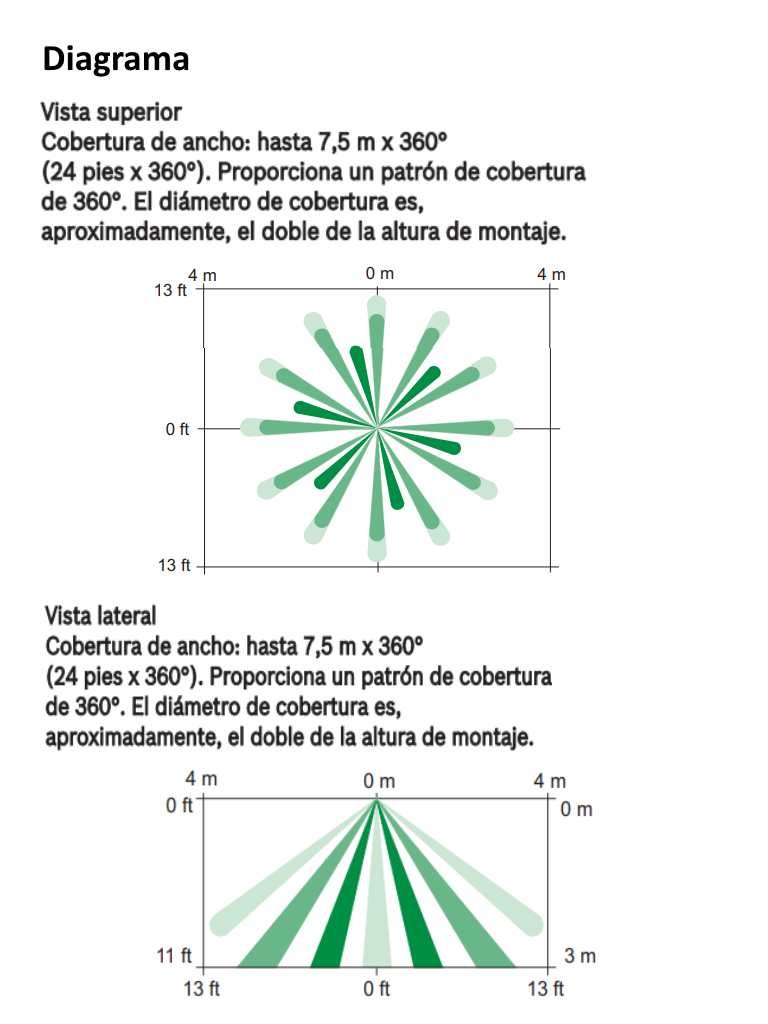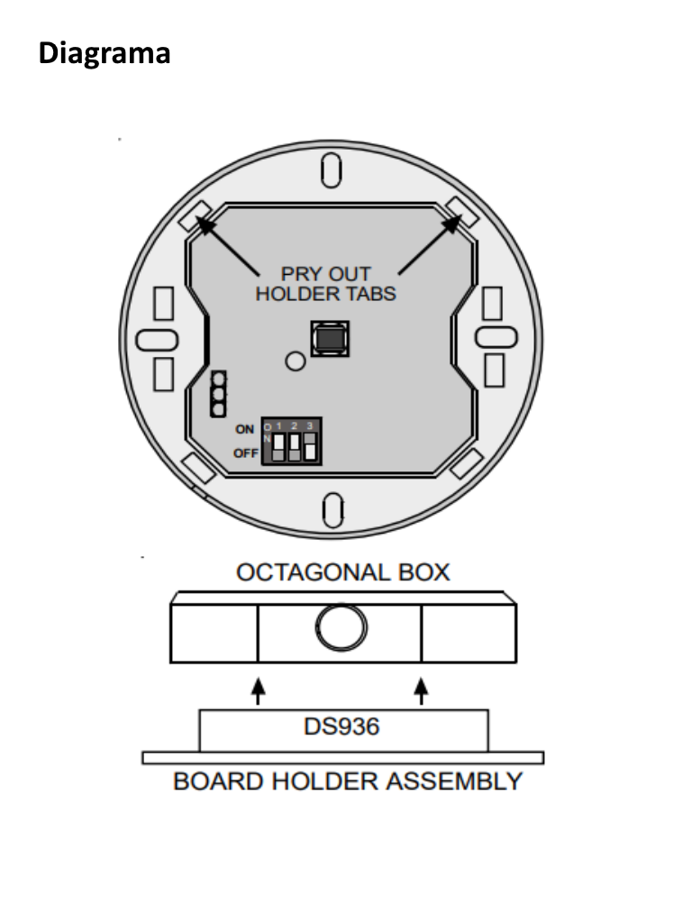 Nota: Detector PIR panorámico de bajo perfil DS936 Proporciona un procesamiento mejorado de señales, patrón de 360° x 7,5 m (24 pies) y se monta en superficie o semiempotrado en un techo. Número de pedido: DS936 Principales características