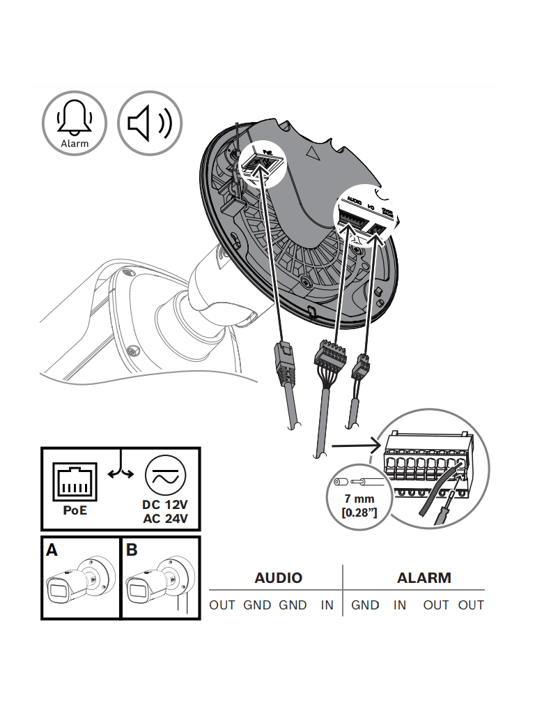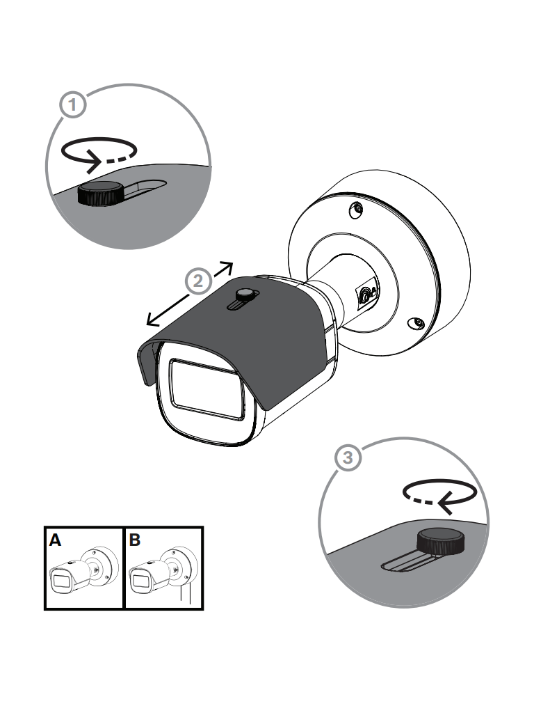 La cámara NBE-5703-AL utiliza el concepto de eficacia probada de instalación en tres pasos. La placa de montaje dispone de varios patrones de agujeros para la instalación en cajas eléctricas (cuadradas de 4 pulg. y dos entradas) y en los accesorios universales de Bosch. La caja trasera se puede acoplar con un sencillo giro y clic. Todos los cables se pueden conectar en la caja trasera.