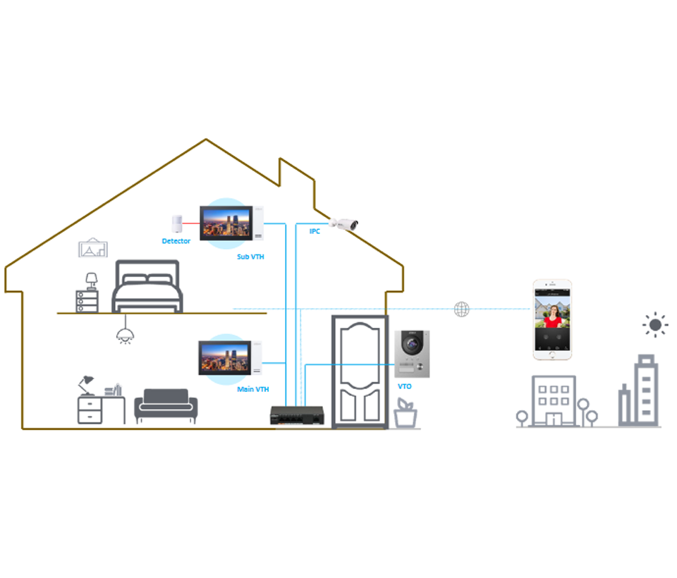 Con el VTO2202FP podemos agregar 1 Maestro y monitores / extensiones IP (VTH) los cuales pueden realizar llamadas entre si al mismo tiempo, con esto es posible conversar entre los monitores que se encuentran conectados a un mismo frente de calle, ejemplo: el monitor de la sala puede tener comunicación con el monitor de una recámara o cocina, etc. |