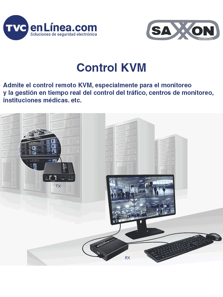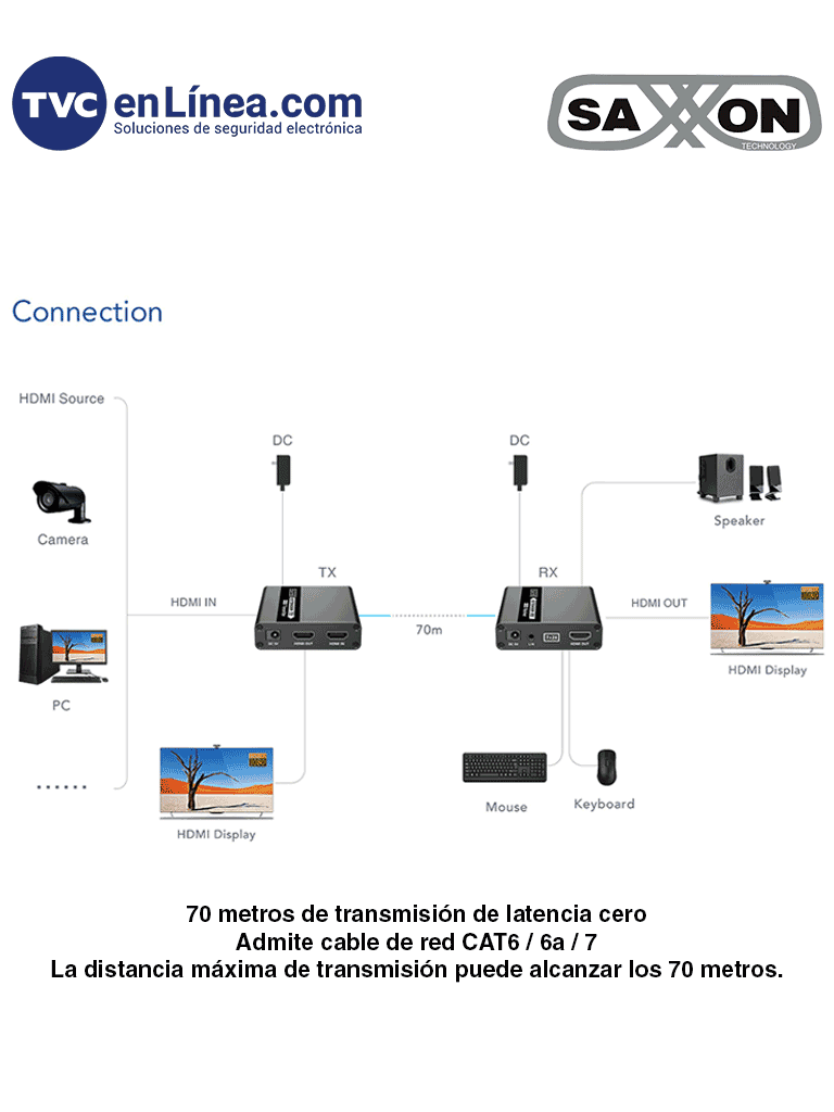 SAXXON LKV223KVM – Kit Extensor KVM de Video HDMI y Puerto USB/ Resolución 1080P @ 60 Hz/ HDR/ Hasta 70 metros con Cat6/6A/7/ Cero latencia/ Loop HDMI en Transmisor/ Salida de audio/ Función EDID/
