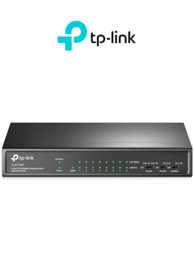 TP-LINK TL-SF1009P - Switch PoE no administrable con 9 puertos Fast Ethernet, incluidos 8 puertos PoE AF y AT. Ofrece un presupuesto PoE de hasta 65W y soporta modo extendido para conexiones de hasta 250 metros.