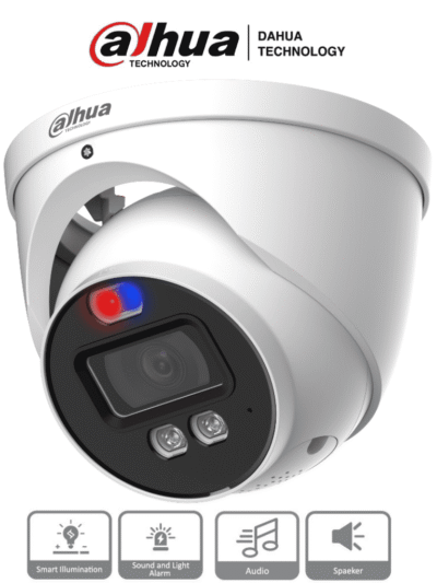 Dahua HAC-ME1239HN-A-PV - Cámara Domo TiOC de 2 Megapixeles/ Disuasion Activa Luz Roja y Azul/ Lente de 3.6 mm/ Super Adapt/ Microfono y Altavoz Integrados/ 40 Metros de Iluminación (IR y Cálida)/ Metalica/ IP67/