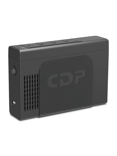 El CDP R-UPR604 es un UPS interactivo con regulador de voltaje (AVR) integrado y amplio rango de funcionamiento. Proporciona respaldo de energía confiable, protección contra picos de voltaje y regulación automática, asegurando el funcionamiento estable de los equipos conectados. Incluye indicadores LED, botón de encendido, cuatro tomas NEMA 5-15R con respaldo y protección, cable de entrada CA y orificios para montaje en pared.